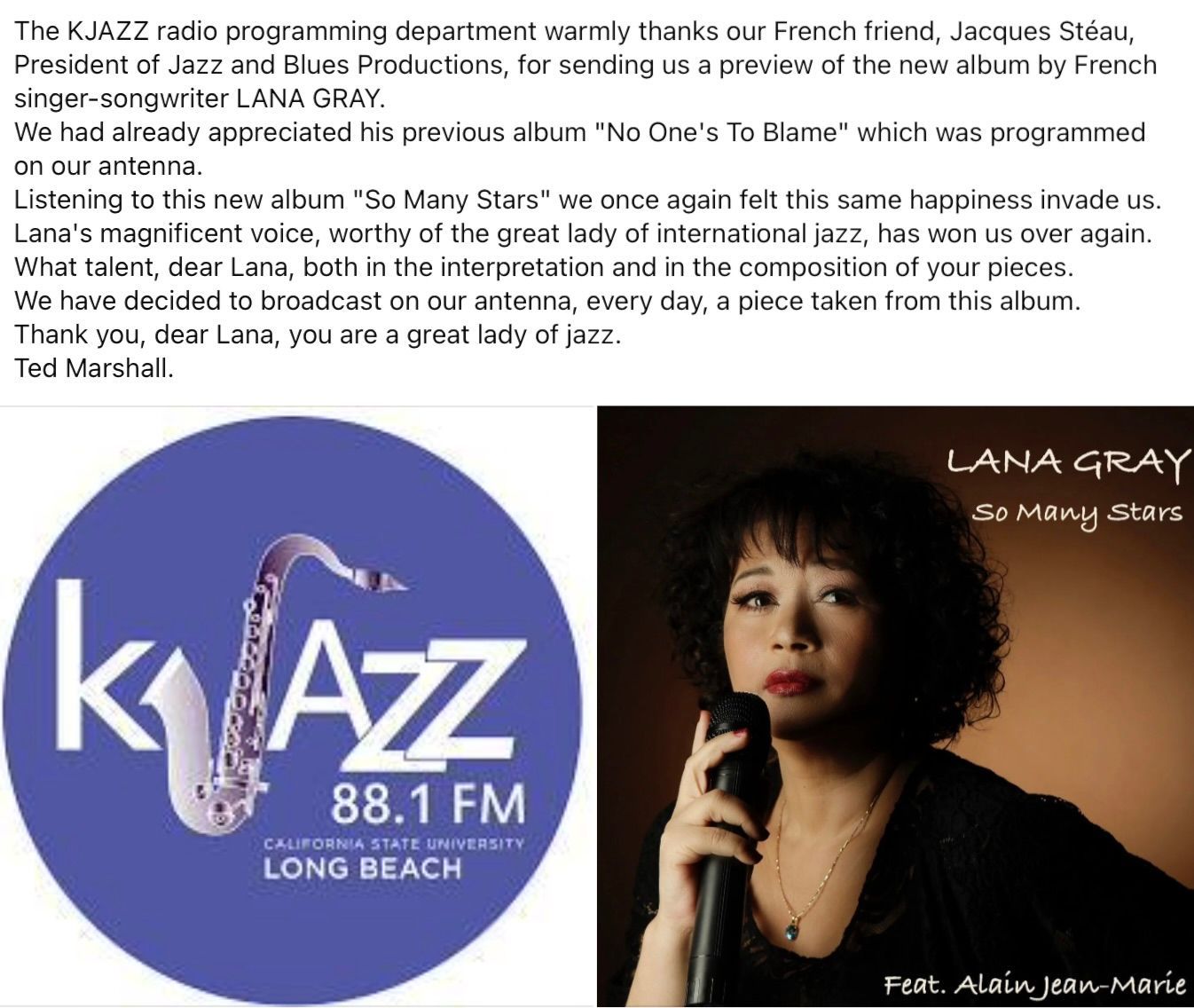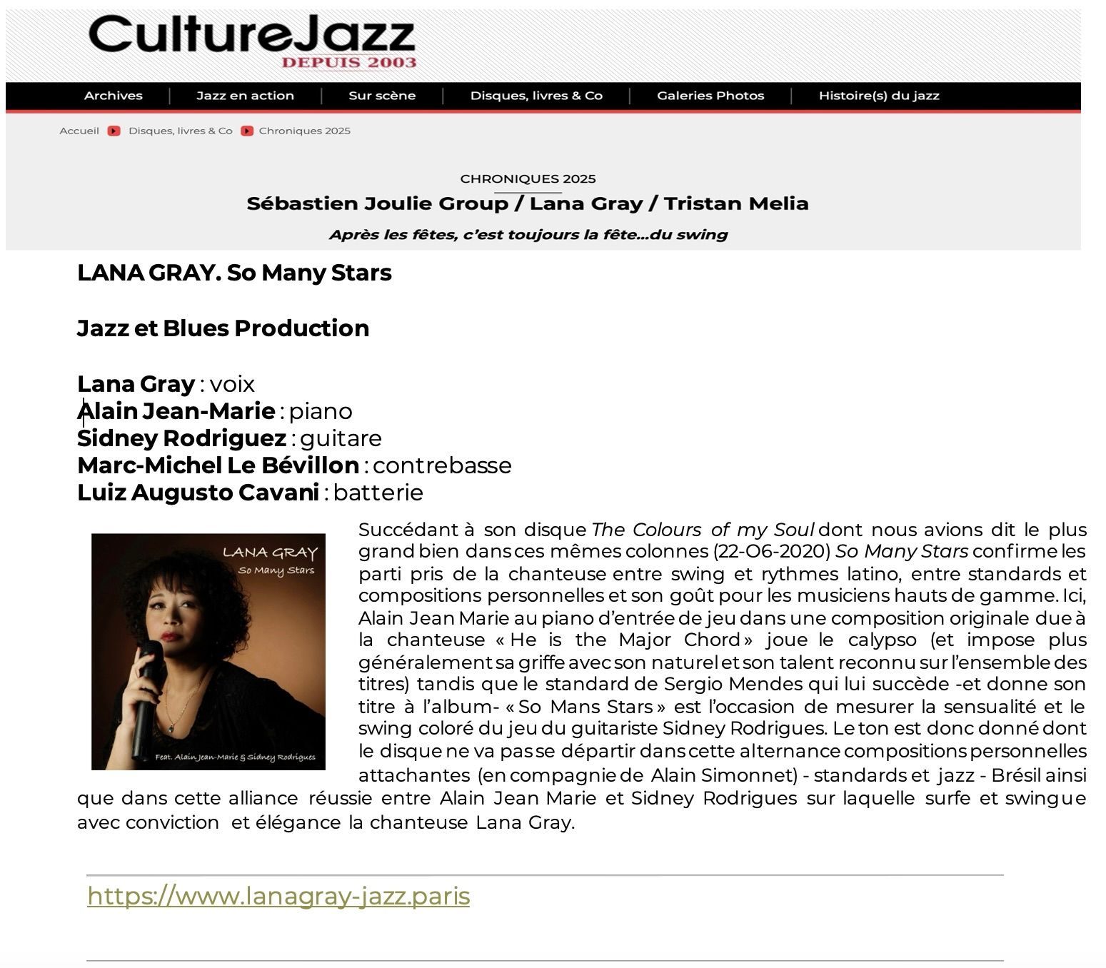 ...Lana Gray nous propose son quatrième album. On y retrouve le guitariste brésilien Sidney Rodrigues mais c’est un invité de marque qui est présent cette fois, le pianiste Alain Jean-Marie. La rythmique étant plus qu’à la hauteur de ces deux figures avec deux musiciens aux références majeures, le groupe sonne vraiment très bien, permettant à Lana de développer librement son chant et son swing. Quatre compositions originales enrobent quatre standards : « So Many Stars » de Sergio Mendès, « On a clear day », « You’re blase » et « Day by Day ». On se promène ainsi de swing en ballades, de blues en musique brésilienne dans une atmosphère très sereine. Alain Jean-Marie ne nous prive pas de son talent prenant souvent « la parole » relayé avec élégance par Sidney Rodrigues. Du chant donc avec sa rigueur mais du jazz aussi avec sa liberté, du vrai jazz vocal, pas de la chanson accompagnée.