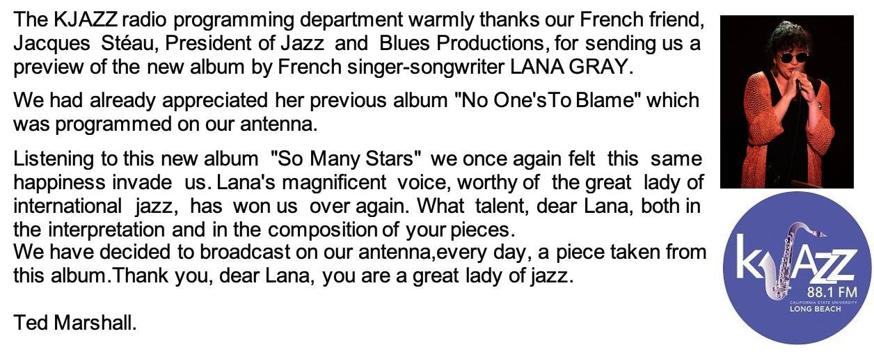 ...Lana Gray nous propose son quatrième album. On y retrouve le guitariste brésilien Sidney Rodrigues mais c’est un invité de marque qui est présent cette fois, le pianiste Alain Jean-Marie. La rythmique étant plus qu’à la hauteur de ces deux figures avec deux musiciens aux références majeures, le groupe sonne vraiment très bien, permettant à Lana de développer librement son chant et son swing. Quatre compositions originales enrobent quatre standards : « So Many Stars » de Sergio Mendès, « On a clear day », « You’re blase » et « Day by Day ». On se promène ainsi de swing en ballades, de blues en musique brésilienne dans une atmosphère très sereine. Alain Jean-Marie ne nous prive pas de son talent prenant souvent « la parole » relayé avec élégance par Sidney Rodrigues. Du chant donc avec sa rigueur mais du jazz aussi avec sa liberté, du vrai jazz vocal, pas de la chanson accompagnée.
